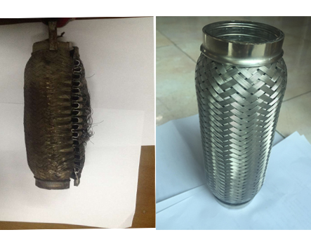 It is sometimes very easy to notice a flex pipe that is starting to break down.During the beginning stages you may just hear a slight exhaust leak during your vehicle's start up and it will go away for the most part due to it not having a major leak, but when it finally does let go you will know it! Most flex pipes will break from the inside accordion piece and it will sound as though you have no exhaust whatsoever. Other forms of a flex pipe leaking can be caused by your car bottoming out and tearing the outer protective mesh and scraping a hole into the flex tube or it could just be from deterioration. Here is an example of what a damaged flex pipe and a new one look like: